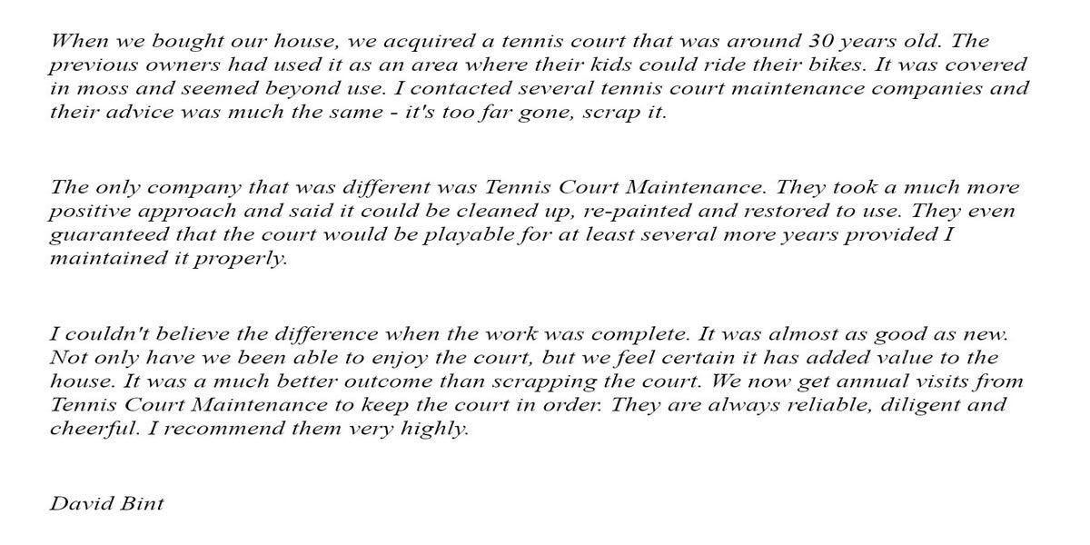 Working with us at Tennis Court Maintenance couldn't be more easy with our personal and friendly service, which is always tailored to suit the individual needs of you. We have been involved in tennis court maintenance for over 25 years and we bring all of that experience to every job we do. We are a family run business that is completely customer satisfaction focused, not only do we provide a efficient, professional service we also bring a flexible and personal approach as is evidenced by our clients, some of whom have been with us for many many years. Our clients can have the peace of mind that all work is carried out to SAPCA and LTA specifications and regulations.